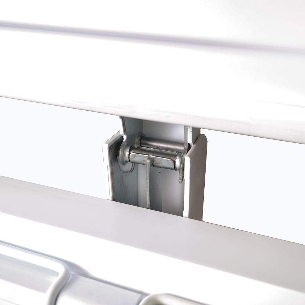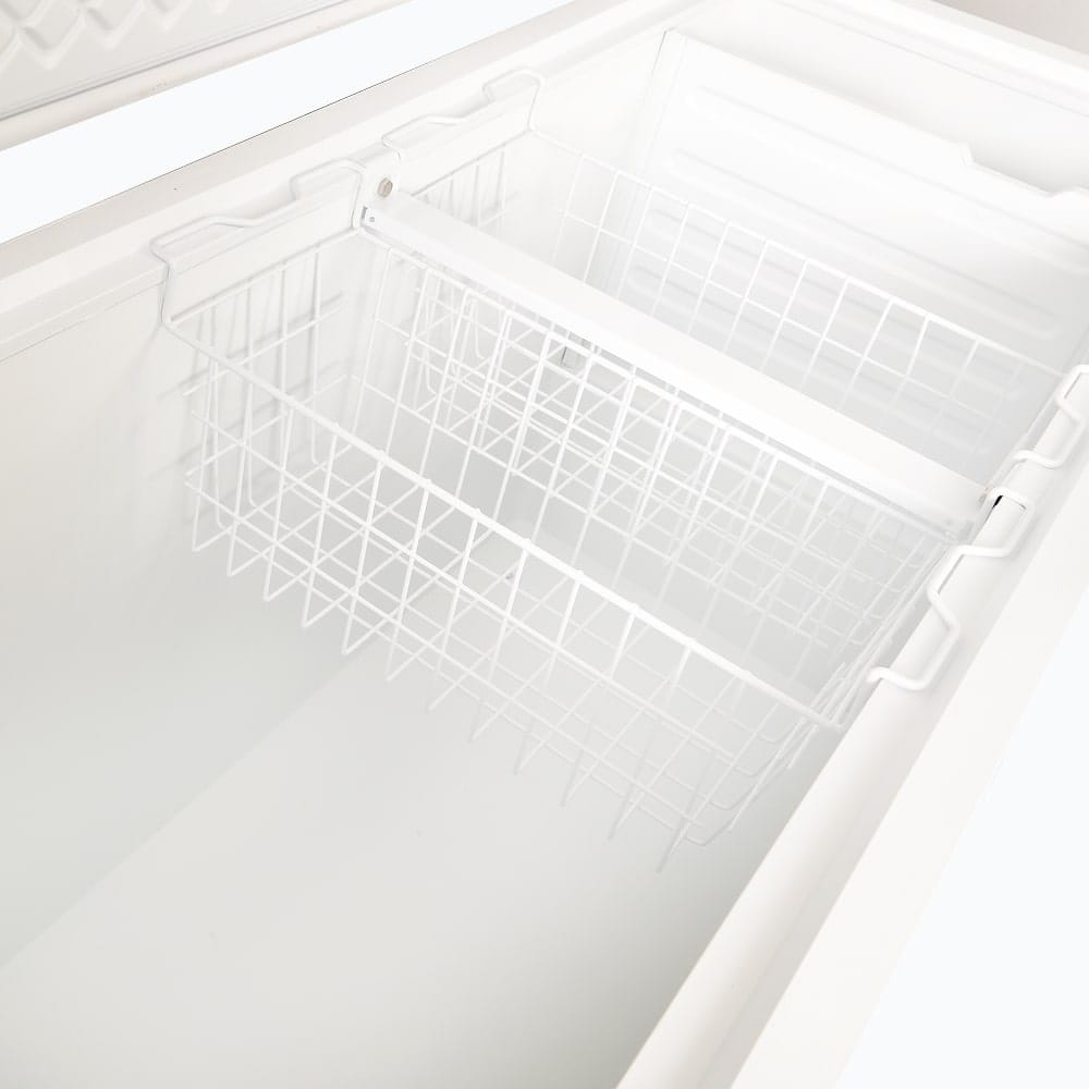 Save on electricity bills with an 9-star GEMS energy rating thanks to natural refrigerant. | The flat top solid stainless steel lid doubles as a sturdy work surface for added convenience. | 2 included storage baskets keep your items neatly organised and easily accessible. | The easy lift, dual hinged lid allows for effortless opening and closing, ensuring quick and convenient access to your stored items. | The integrated lock provides added security, giving you peace of mind knowing that your valuable contents are protected. | The digital display allows you to monitor temperature and easily adjust it with analogue controller. | The quick-drain plug simplifies the defrosting and cleaning process, saving you time and hassle. | Whether you need to rearrange your space layout or clean the area, the lockable front castors make moving and placing the freezer a breeze. |