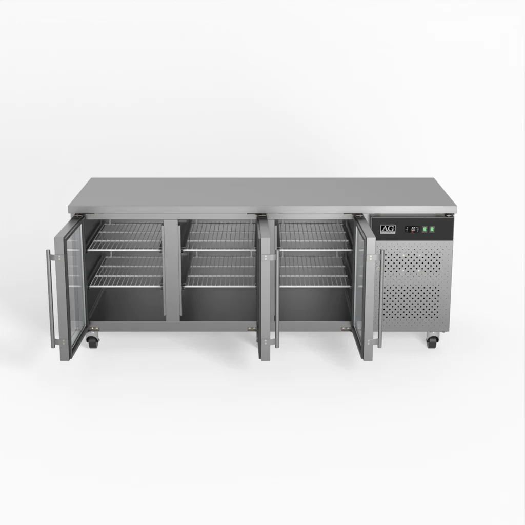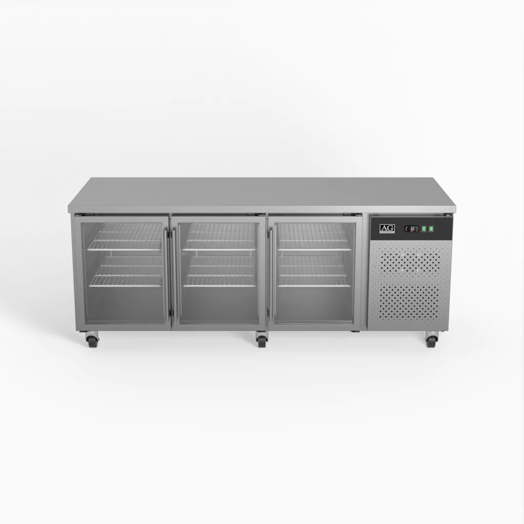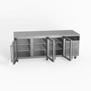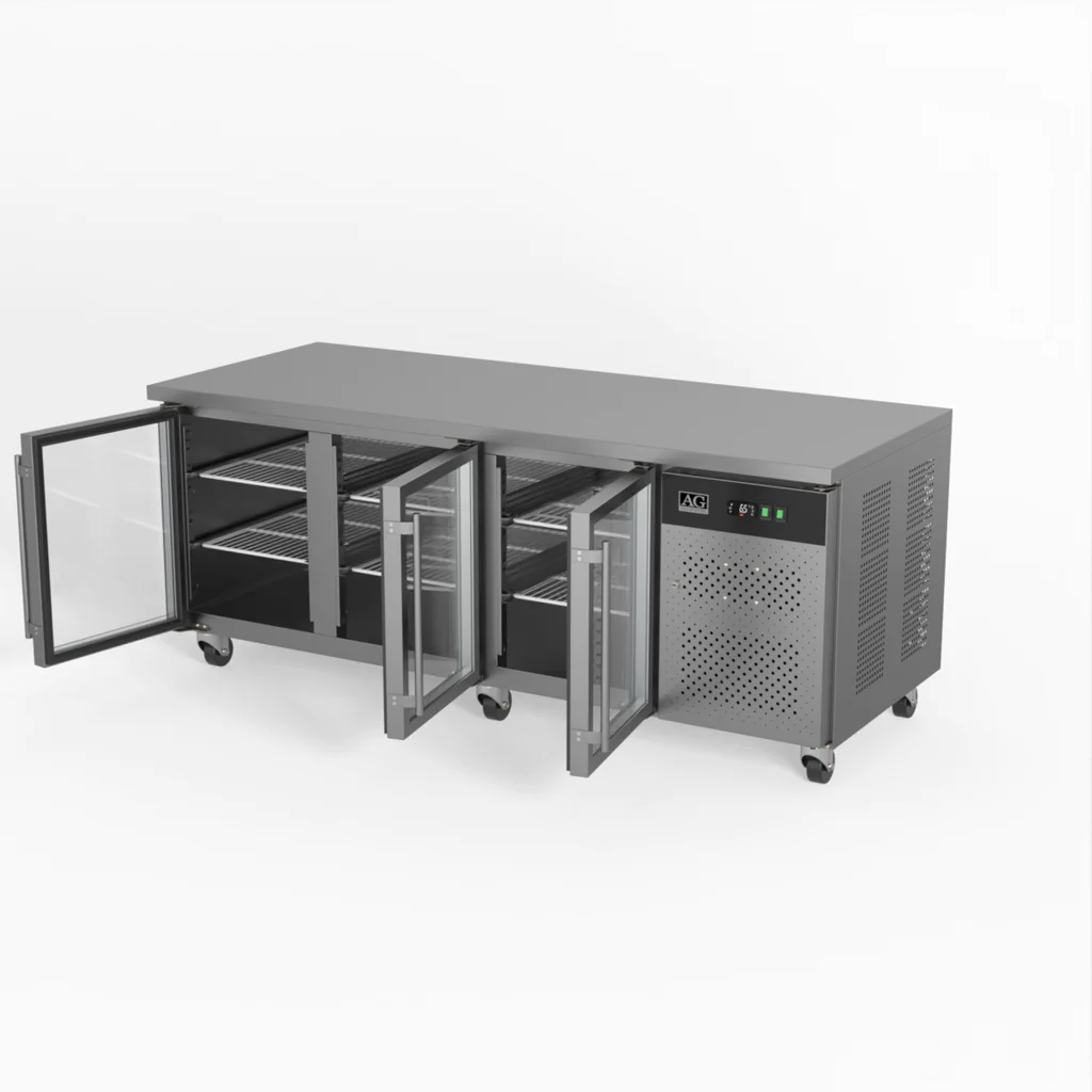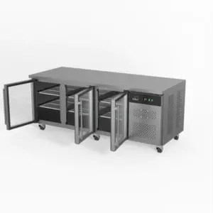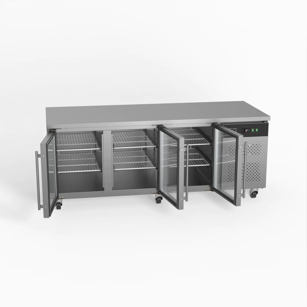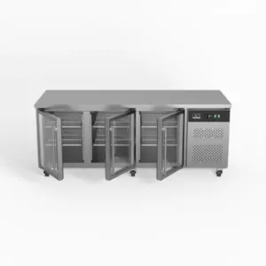 This three-door display commercial bench refrigerator has adjustable shelves plus a unique centre-shelf connector between so you can utilise the full 580L storage capacity. Each of the three doors has two shelves allowing storage of up to six patisseries (600mm x 400mm) trays or pans.